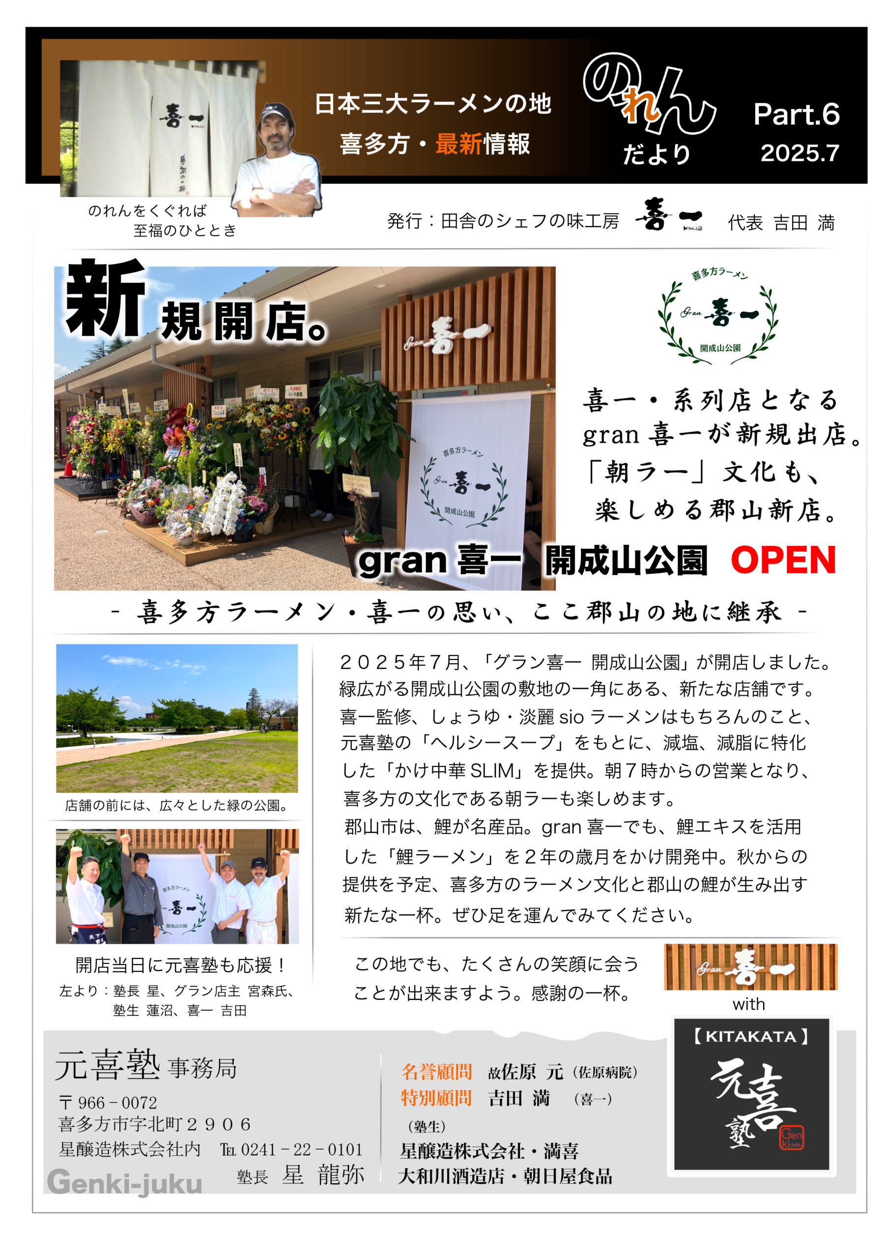 2025年7月、「グラン喜一 開成山公園」が開店しました。緑広がる開成山公園の敷地の一角にある、新たな店舗です。喜一監修、しょうゆ・淡麗sioラーメンはもちろんのこと、元喜塾の「ヘルシースープ」をもとに、減塩、減脂に特化した「かけ中華SLIM」を提供。朝7時からの営業となり、喜多方の文化である朝ラーも楽しめます。
